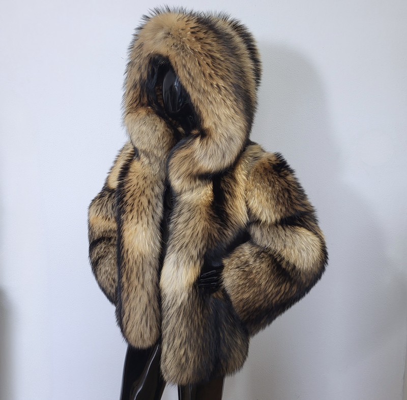 Brand new finnraccoon fur coat made with whole skins with large double sided hood